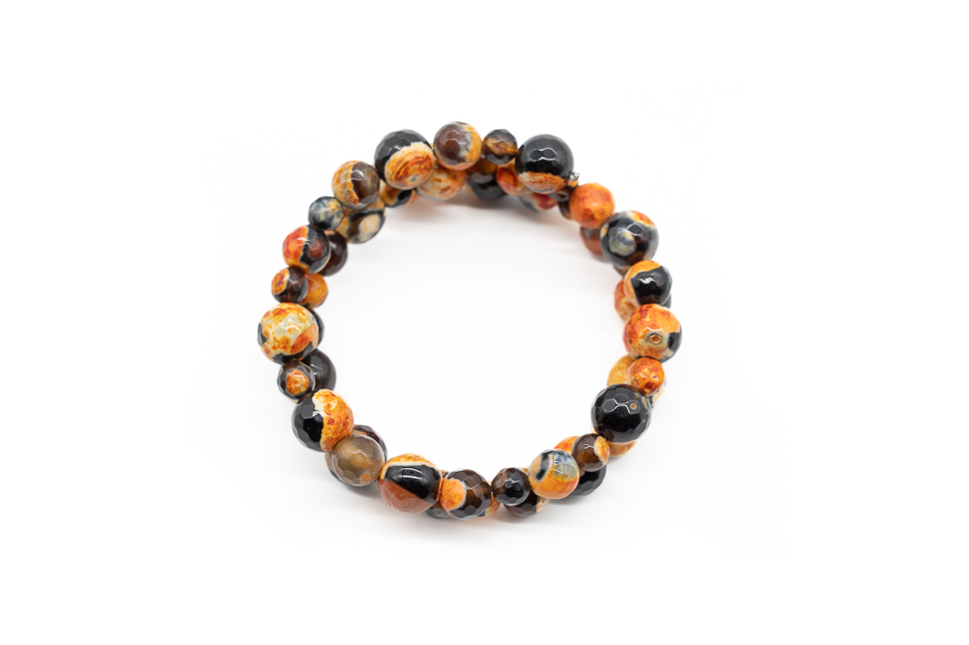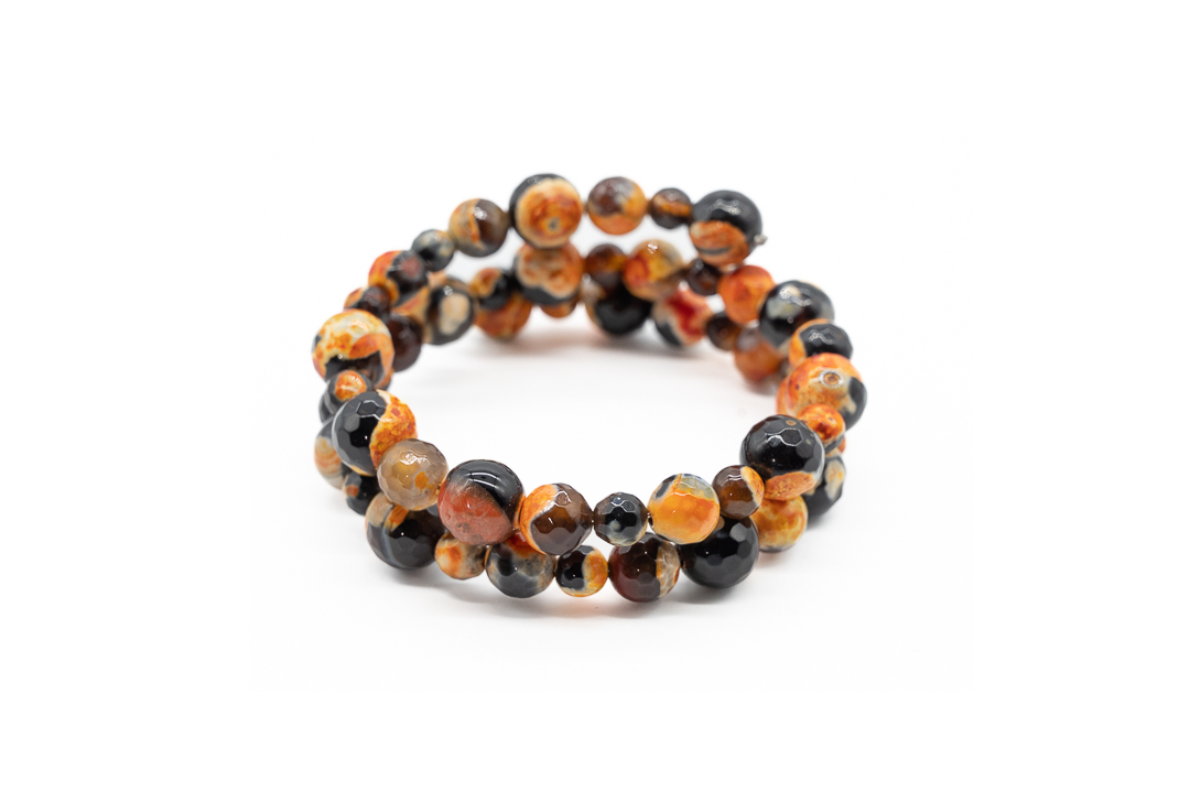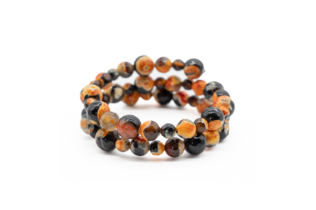 Margele de piatra pretioasa de agat de foc se remarca prin aspectul pe care il castiga in urma incalzirii la temperaturi extreme. Multe dintre aceste margele contin o substanta alba, nenaturala pe exteriorul margelei, care este folosita pentru a accentua fracturile din piatra.