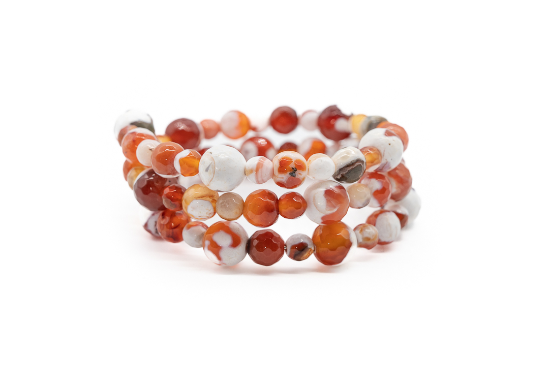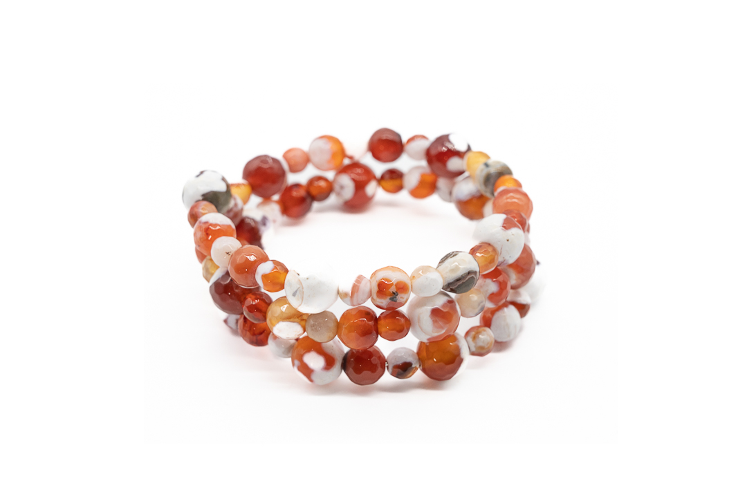 Margele de piatra pretioasa de agat de foc crackle se remarca prin aspectul pe care il castiga in urma incalzirii la temperaturi extreme. Multe dintre aceste margele contin o substanta alba, nenaturala pe exteriorul margelei, care este folosita pentru a accentua fracturile din piatra.